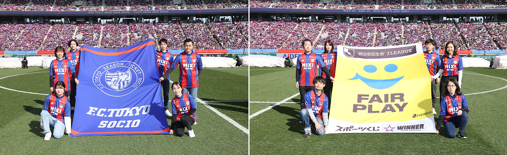 キックオフ前、入場する選手に先駆けてフェアプレイフラッグを6名で持ち、ピッチに登場いただきます。