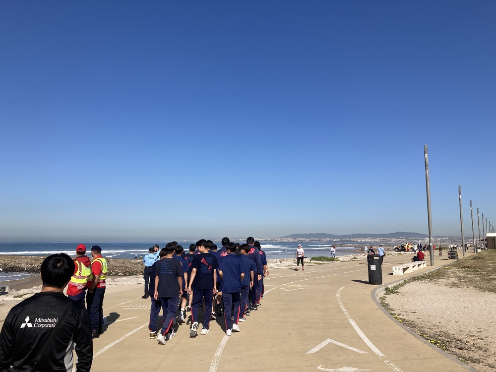 朝食を食べた後は、少し休憩をしたのち、午前中は18:30キックオフの試合に備え、海岸沿いを1時間程度かけ散歩をしました。今回の宿泊先のエリアにある海はサーフィンで有名なスポットでもあり、世界中の海を舞台に開催されるワールドサーフィンリーグの大会が開催されており、散歩中に見学することが出来ました。