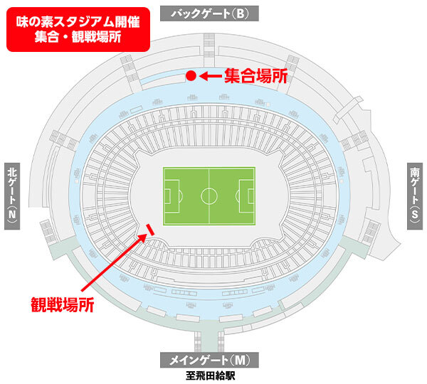 ・キックオフの1時間前の集合を予定しております。集合時間になりましたらピッチサイドシートへの移動を開始いたします。集合時間に遅れた場合、集合場所でしばらく待機いただきますので予めご了承ください。