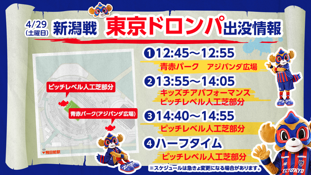 4月29日(土祝) 2023明治安田生命J1リーグ 第10節 vs アルビレックス新潟 (15:00キックオフ/味の素スタジアム)に東京ドロンパが下記の通りあらわれます。