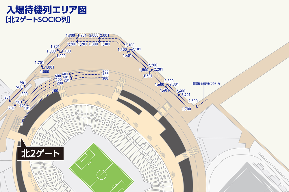 開門後からキックオフの時間に合わせてご来場いただいた場合でも、お座りいただく座席はございますので、必ずしも並ぶ必要はありません。