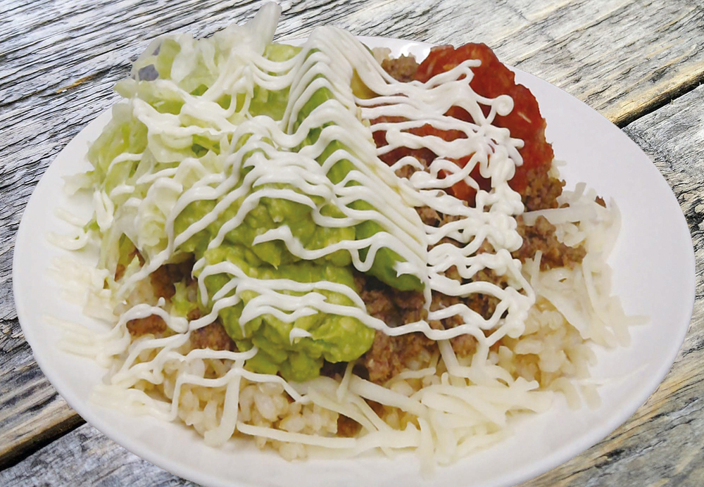 つぶしたてのアボガドディップとスライスがのった自然栽培玄米使用のタコライスです。