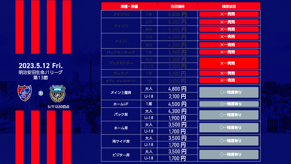 2023明治安田生命J1リーグ 第13節 FC東京 vs 川崎フロンターレ(19:30キックオフ/国立競技場)の当日券販売につきまして、下記のとおりお知らせいたします。