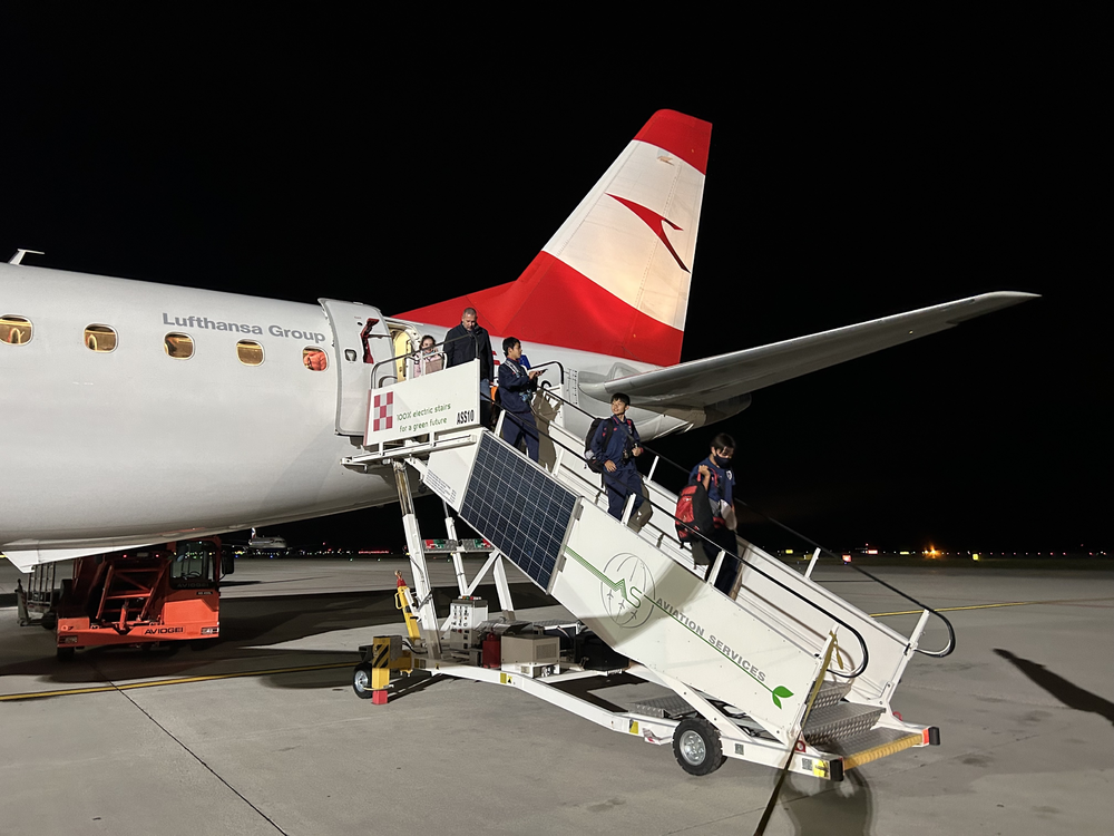 成田国際空港を出発し約14時間掛けオーストリアのウィーン国際空港に到着。その後、イタリアのヴェネツィア・テッセラ空港まで約2時間掛け移動しました。