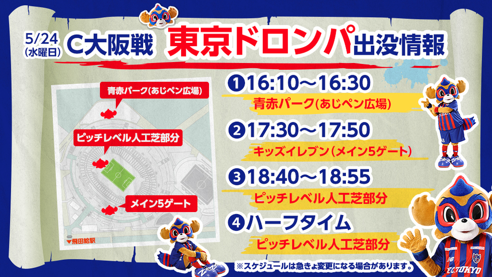 5月24日(水) 2023 JリーグYBCルヴァンカップ グループステージ第5節 vsセレッソ大阪(19:00キックオフ/味の素スタジアム)に東京ドロンパが下記の通りあらわれます。