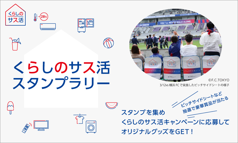 くらしのサス活ブースにて配布しているスタンプラリーの台紙をもらい、各ブースや会場内でのサステナブルな活動への参加でもらえるスタンプを集め、FC東京ピッチサイドシートなど豪華商品があたる「くらしのサス活キャンペーン」に応募しましょう!応募していただいた方には、参加賞として台紙と引き換えにオリジナル商品をプレゼント!