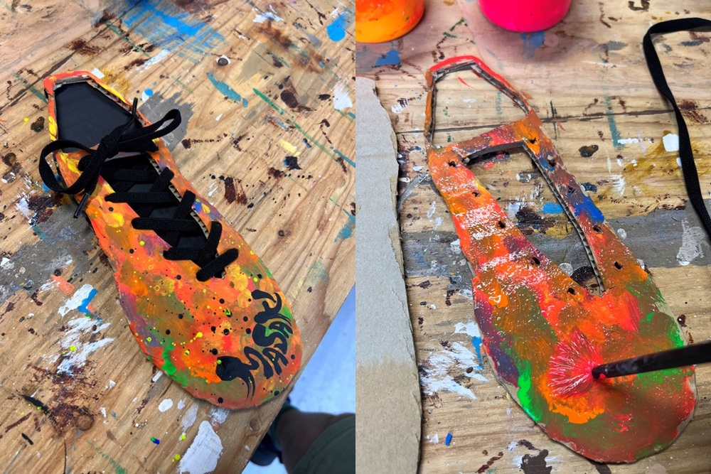 ダンボールを利用してオリジナルスパイクを作りながら同時に靴紐の結び方を学ぶことができます。絵の具を使用してスパイクをカラフルに塗っていき、完成したものにアート書家がお好きなメッセージや名前などを書き足します。楽しく靴紐の結び方を学びながら、世界にひとつだけのオリジナルスパイク飾りを作ることができるワークショップです。
