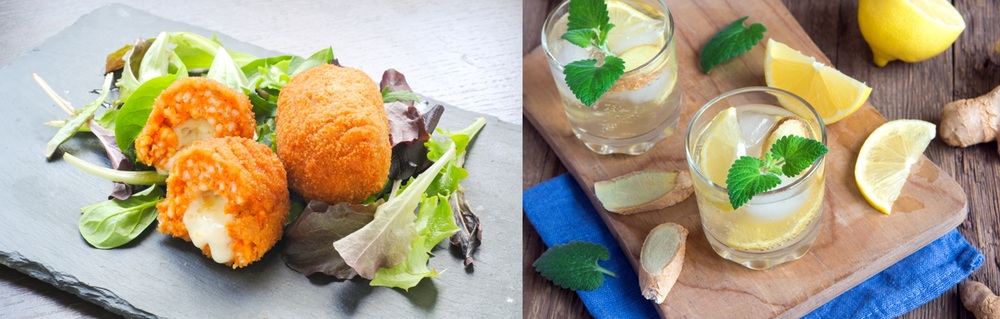 ライスコロッケ、メンチカツ、コロッケ、トルティーヤ、ビール、ハイボール、ジンジャーハイボール