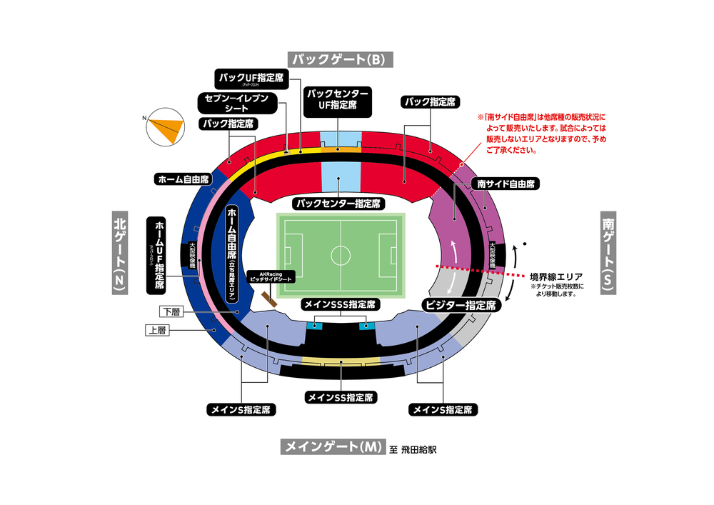 ※メインSS指定席南側、メインS指定席南側は混在エリアとなります。
