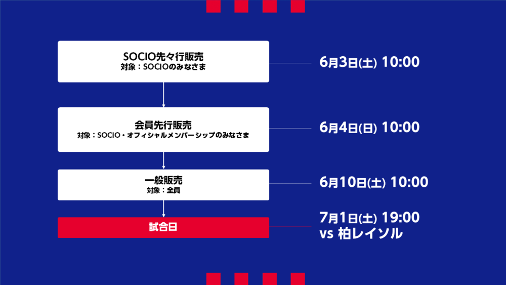 6月3日(土)よりSOCIO先々行販売を開始いたします。SOCIOのみなさまは会員価格にてご購入いただけます(1試合4枚まで)。