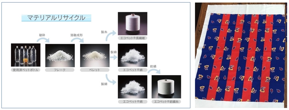 ②砕かれ、溶かされ、ペットボトルはポリエステル繊維、生地に生まれ変わります。