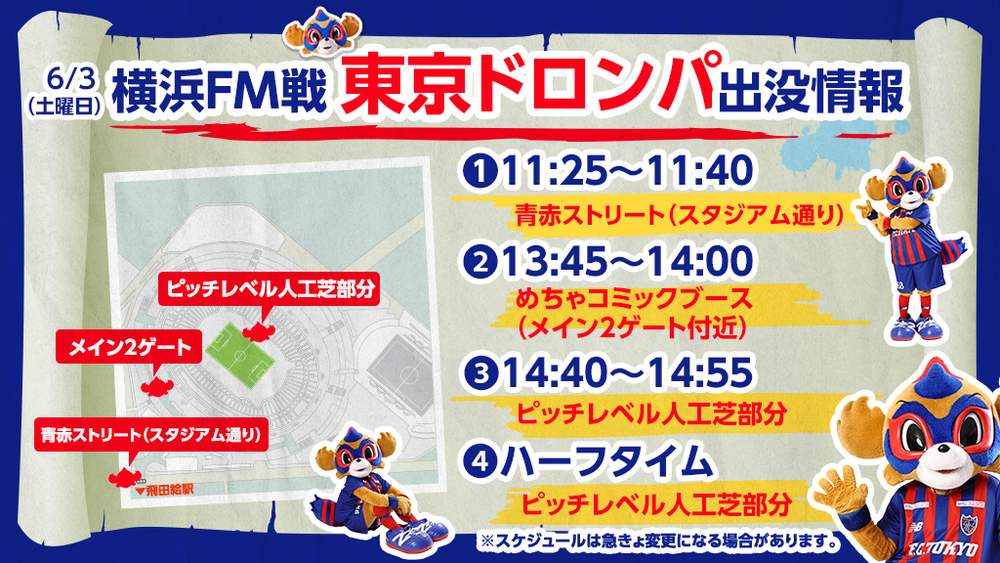 6月3日(土) 2023明治安田生命J1リーグ 第16節 vs 横浜F・マリノス (15:00キックオフ/味の素スタジアム)に東京ドロンパが下記の通りあらわれます。ぜひお楽しみに!
