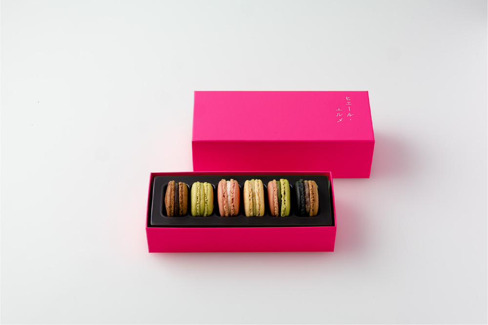 鮮やかなカラーが目を引く限定デザインのボックスに、限定フレーバー「抹茶&ラズベリー」や「こし餡&くるみ」を含む色とりどりのマカロンを詰め合わせました。