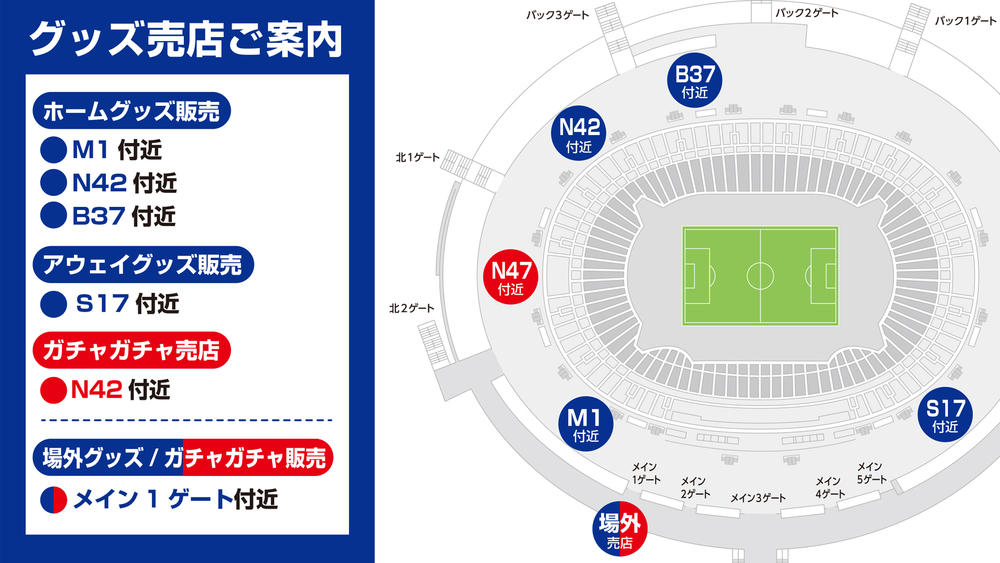 メイン1ゲート場外グッズ売店について10:30から実施予定でしたが、天候の影響により開始時刻が遅れる場合がございます。