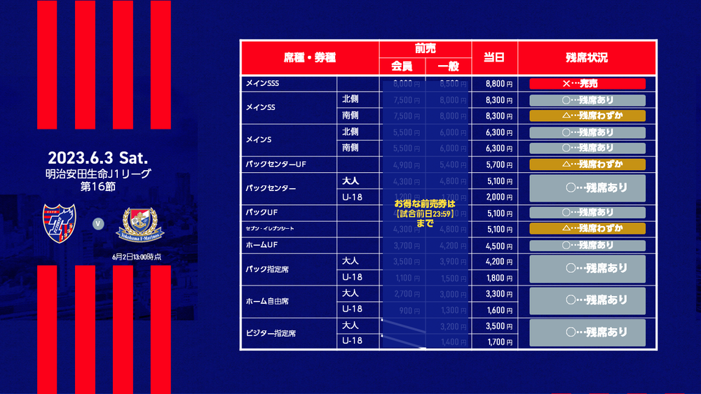 2023明治安田生命 J1リーグ 第16節 FC東京 vs 横浜F・マリノス(15:00キックオフ/味の素スタジアム)の当日券販売につきまして、下記のとおりお知らせいたします。