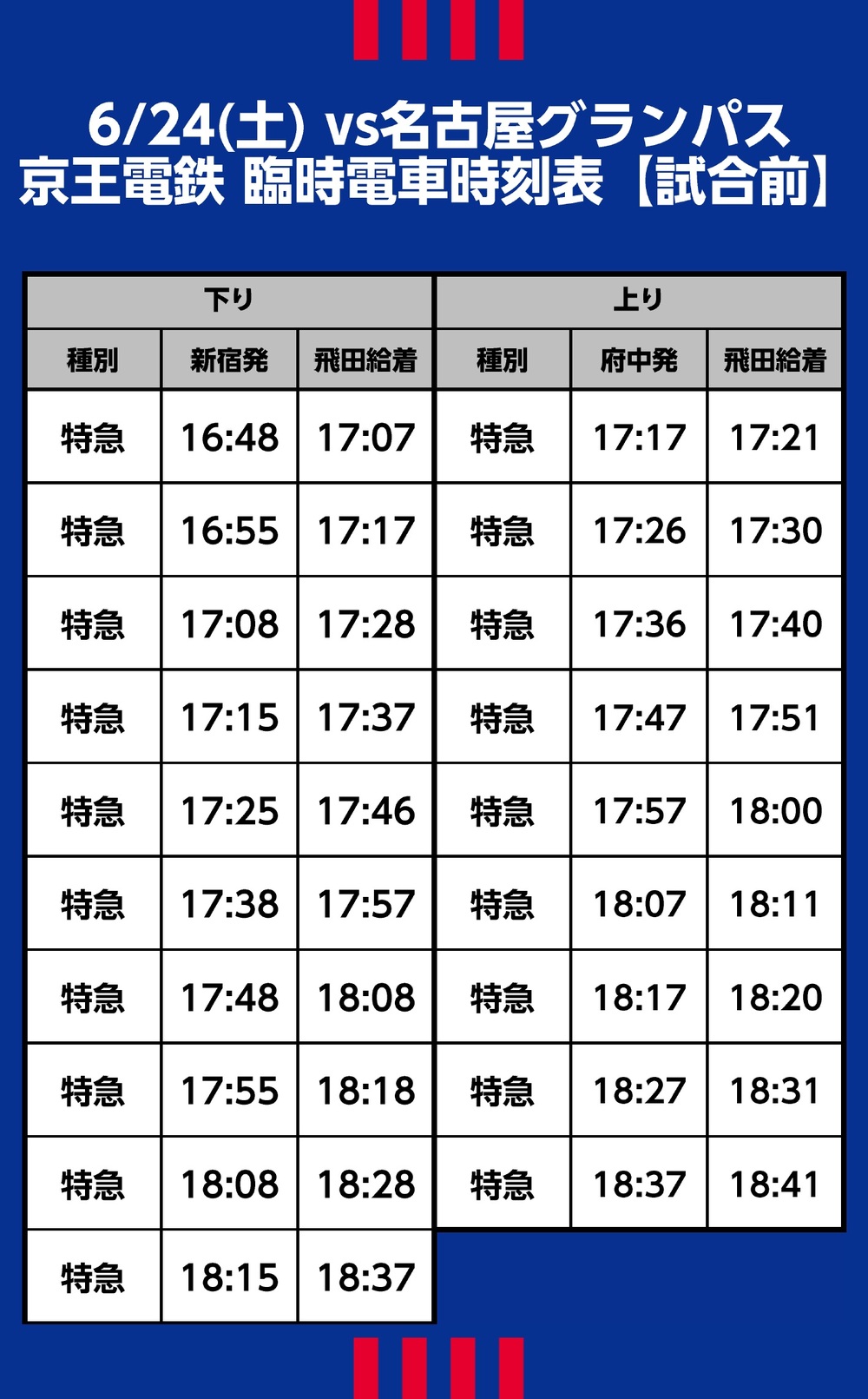 6月24日(土) 2023明治安田生命J1リーグ 第18節 vs 名古屋グランパス(19:00キックオフ/味の素スタジアム)にて運行される臨時交通アクセス(鉄道)、シャトルバス・路線バスについてご案内いたします。