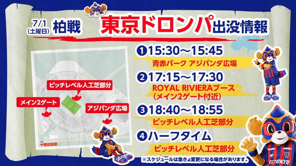 7月1日(土) 2023明治安田生命J1リーグ 第19節 vs 柏レイソル (19:00キックオフ/味の素スタジアム)に東京ドロンパが下記の通りあらわれます。