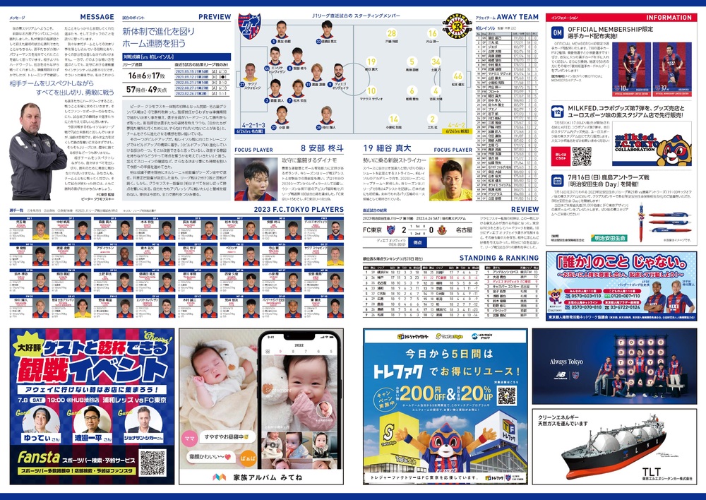7月1日(土) 2023明治安田生命J1リーグ 第19節 vs柏レイソル(19:00キックオフ/味の素スタジアム)のオフィシャルマッチデープログラムについて、下記のとおりご案内いたします。