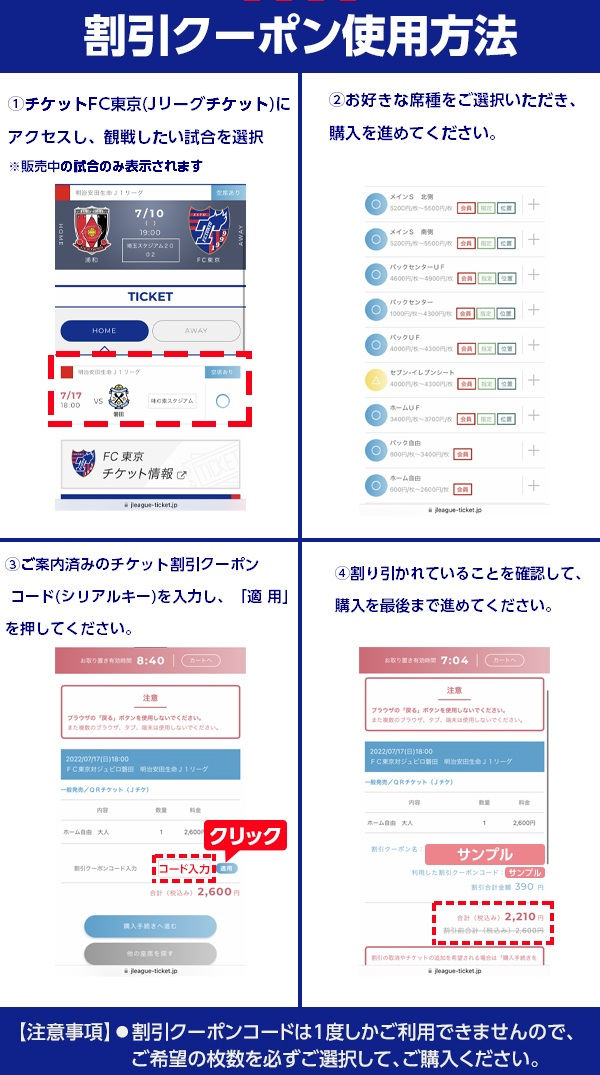 ・この試合はチケット割引クーポンおよび全席種対象招待券対象試合となります。会員先行販売日よりご利用いただけます。チケット割引クーポン用及び全席種対象招待券のシリアルキーは会員証が貼付されていた台紙またはマイページにてご確認ください。なお全券種対象招待券につきましては、ご適用いただくとお会計時に一番高額のチケットがご招待となります。