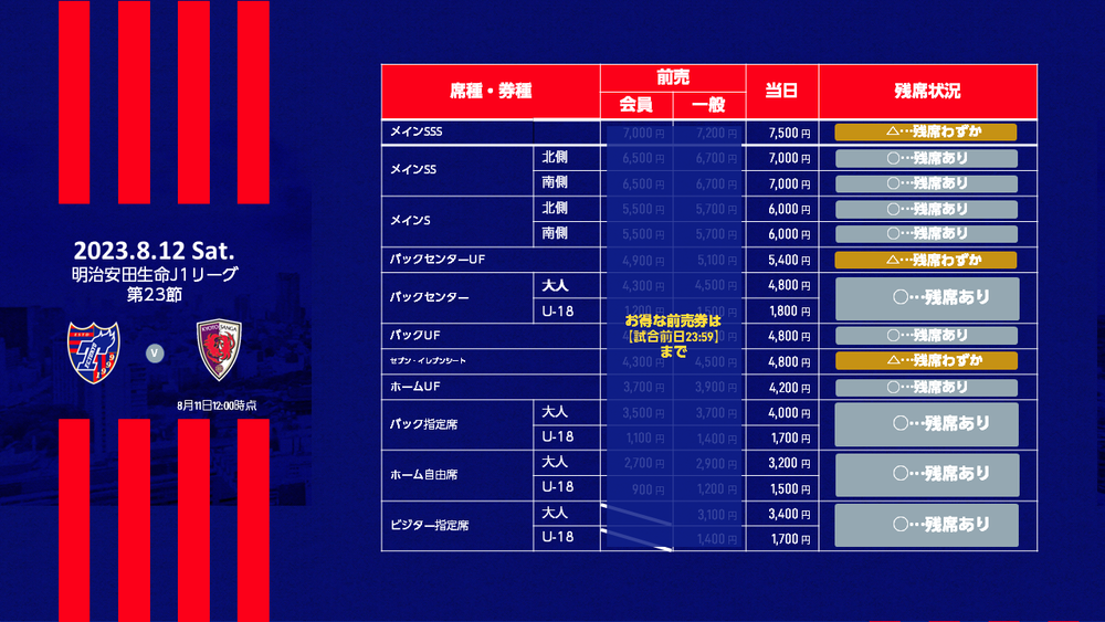 2023明治安田生命 J1リーグ 第23節 FC東京 vs 京都サンガF.C.(19:00キックオフ/味の素スタジアム)の当日券販売につきまして、下記のとおりお知らせいたします。