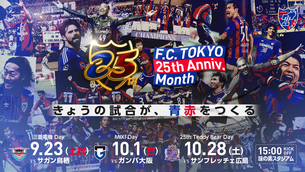 すでにお知らせのとおり「都民の日」=クラブ設立日である10月1日を中心とした3試合を25周年記念試合として実施するほか、9月23日(土祝)サガン鳥栖戦から10月28日(土)サンフレッチェ広島戦までの約1か月間を「F.C.TOKYO 25th Anniv. Month」としてさまざまなイベントを開催いたします。