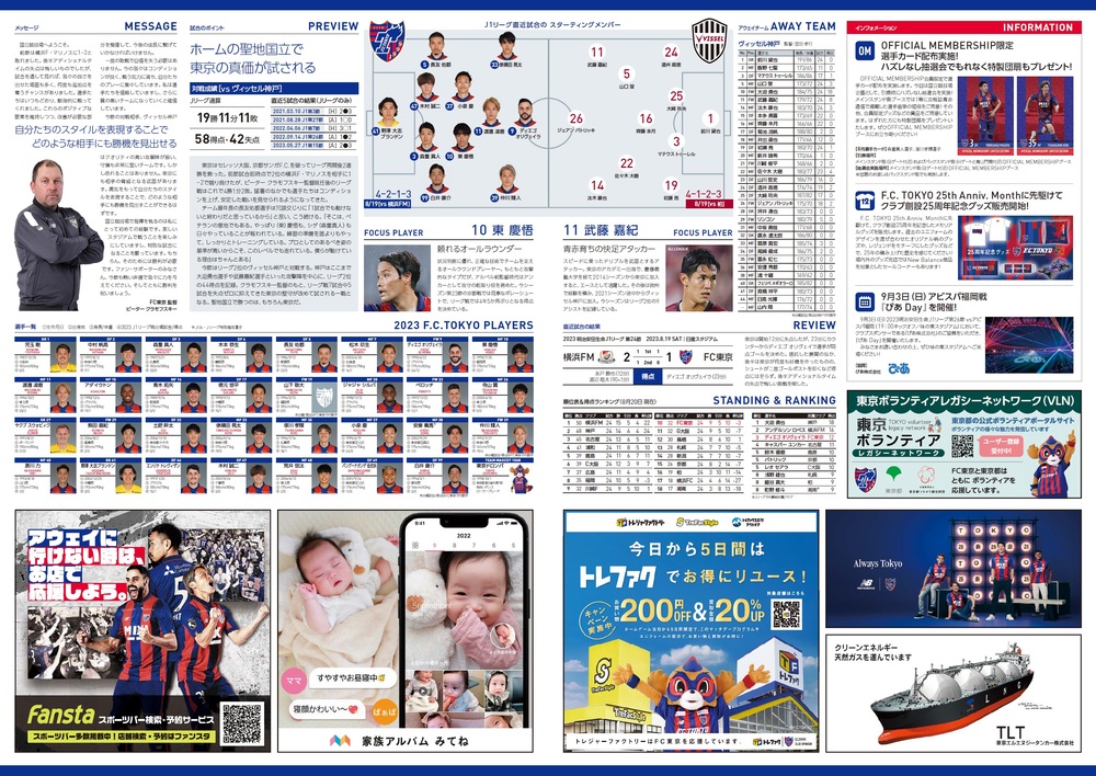 8月26日(土) 2023明治安田生命J1リーグ 第25節 vsヴィッセル神戸(19:00キックオフ/国立競技場)のオフィシャルマッチデープログラムについて、下記のとおりご案内いたします。