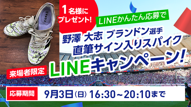 野澤大志ブランドン選手直筆サイン入りスパイクが当たる来場者限定LINEキャンペーン開催のお知らせ
