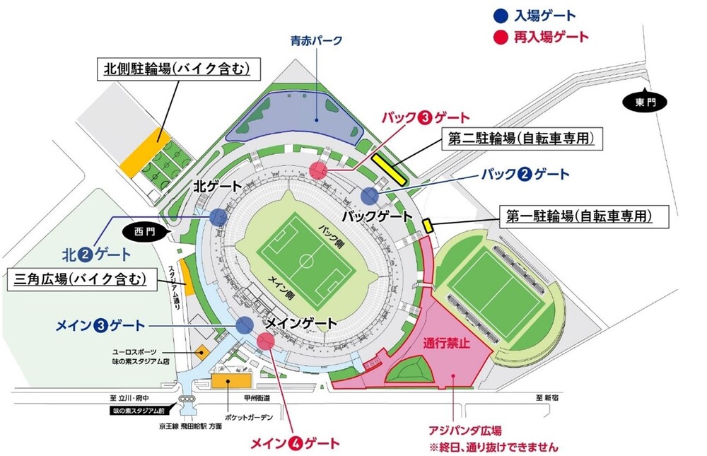 9/6(水)福岡戦自転車およびバイク駐輪場について 2023/8/30 試合情報 9月6日(水)アビスパ福岡戦の自転車およびバイク駐輪場についてお知らせいたします。 □対象試合9月6日(水) vs アビスパ福岡(19:00キックオフ/味の素スタジアム) □使用可能エリア(下記参照)・北側駐輪場(バイク含む)・第一駐輪場(自転車専用)・第二駐輪場(自転車専用)・三角広場(バイク含む)