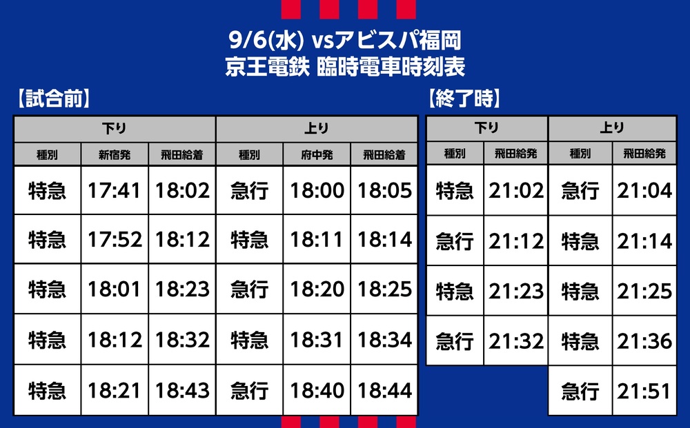 9月6日(水) 2023 JリーグYBCルヴァンカップ プライムステージ 準々決勝 第1戦 vsアビスパ福岡(19:00キックオフ/味の素スタジアム)にて運行される臨時交通アクセス(鉄道)、シャトルバス・路線バスについてご案内いたします。