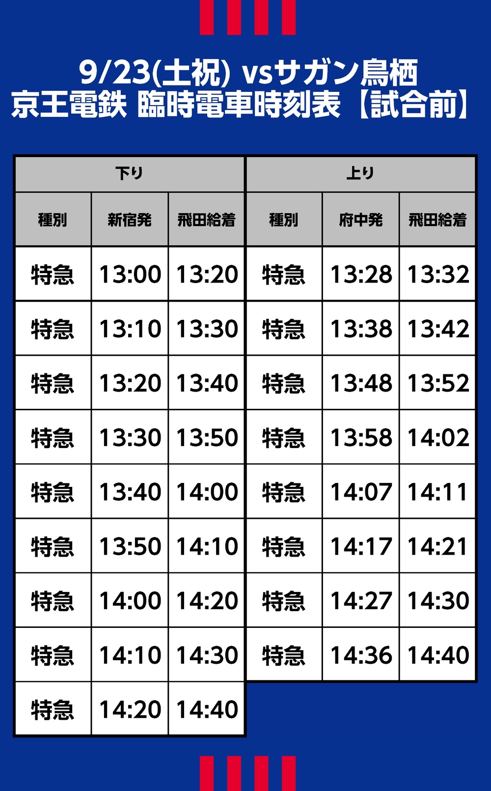 9月23日(土祝) 2023明治安田生命J1リーグ 第28節 vs サガン鳥栖(15:00キックオフ/味の素スタジアム)にて運行される臨時交通アクセス(鉄道)、シャトルバス・路線バスについてご案内いたします。