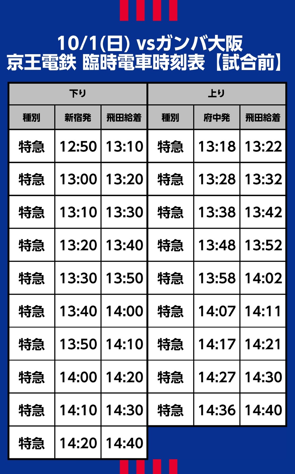 10月1日(日) 2023明治安田生命J1リーグ 第29節 vs ガンバ大阪(15:00キックオフ/味の素スタジアム)にて運行される臨時交通アクセス(鉄道)、シャトルバス・路線バスについてご案内いたします。