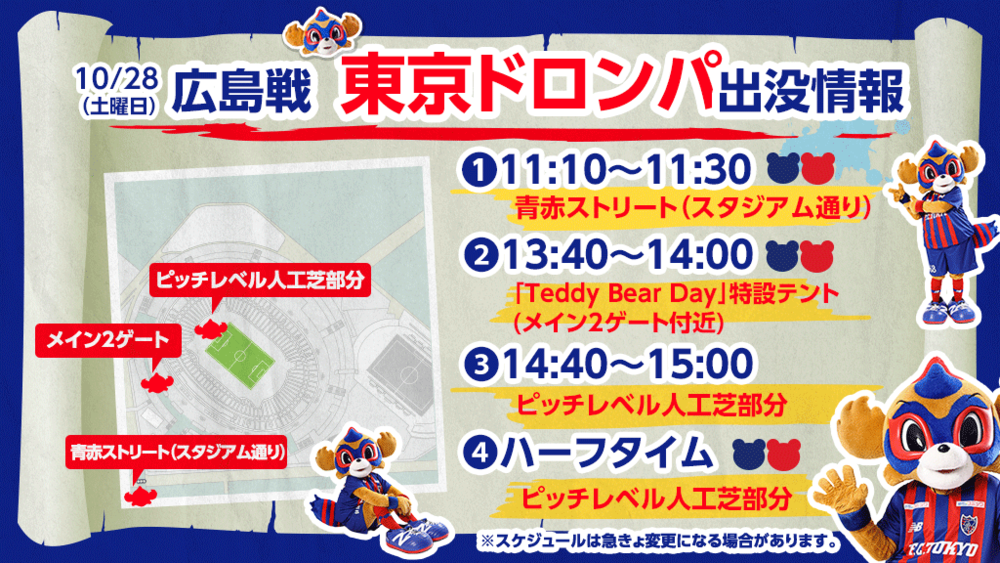 10月28日(土) 2023明治安田生命J1リーグ 第31節 vs サンフレッチェ広島 (15:00キックオフ/味の素スタジアム)に東京ドロンパが下記の通りあらわれます。