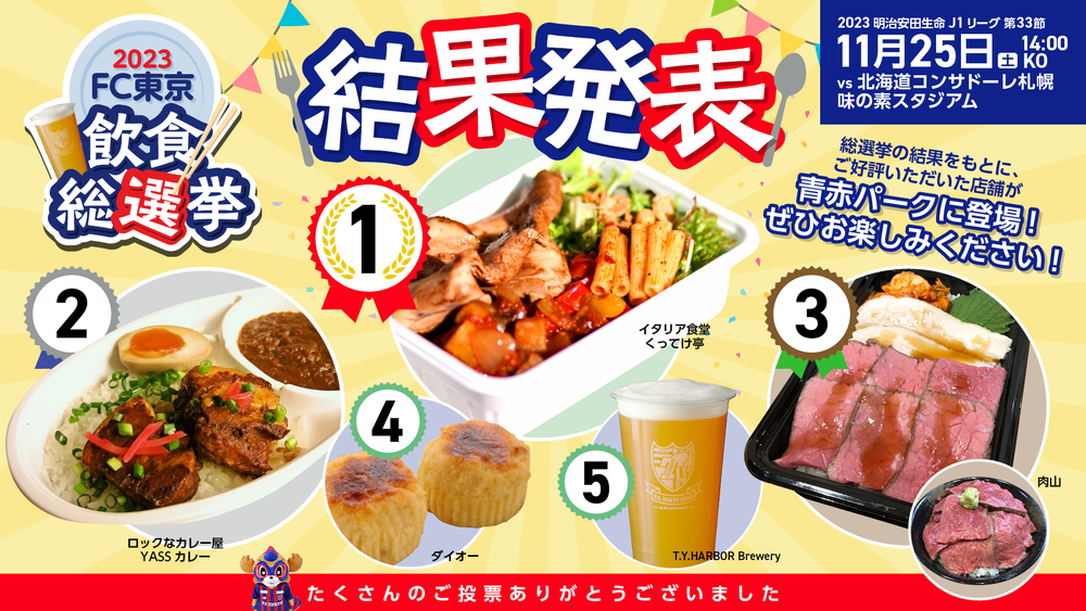 2023 FC東京 飲食総選挙の結果をもとに、ご好評いただいた店舗にご出店いただきます。