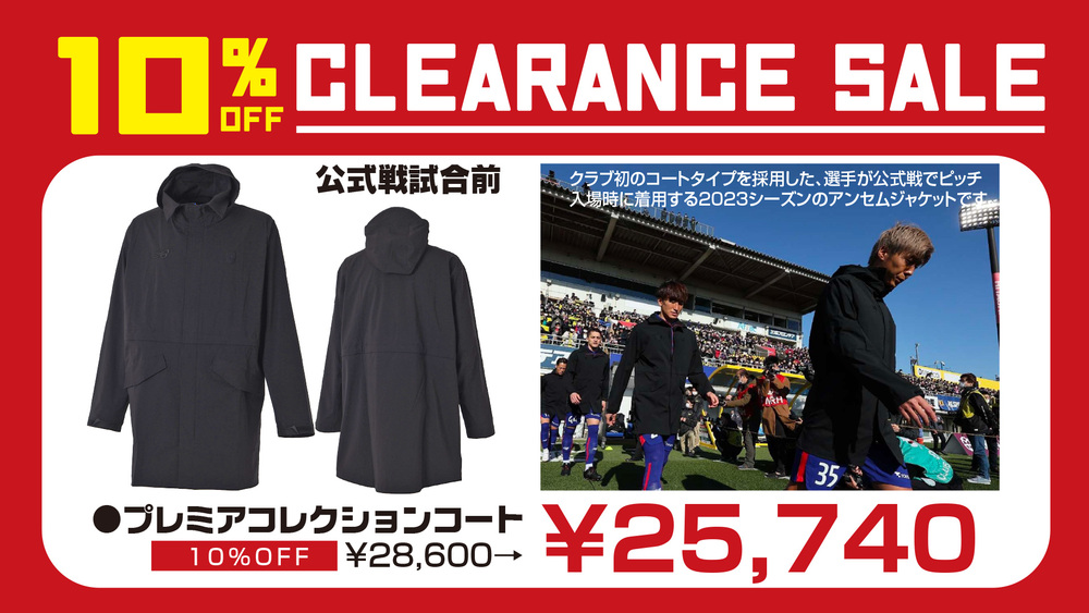 当日はスタジアム内グッズ売店およびユーロスポーツ味の素スタジアム店にて最大30%OFFのクリアランスSALEを実施いたします。