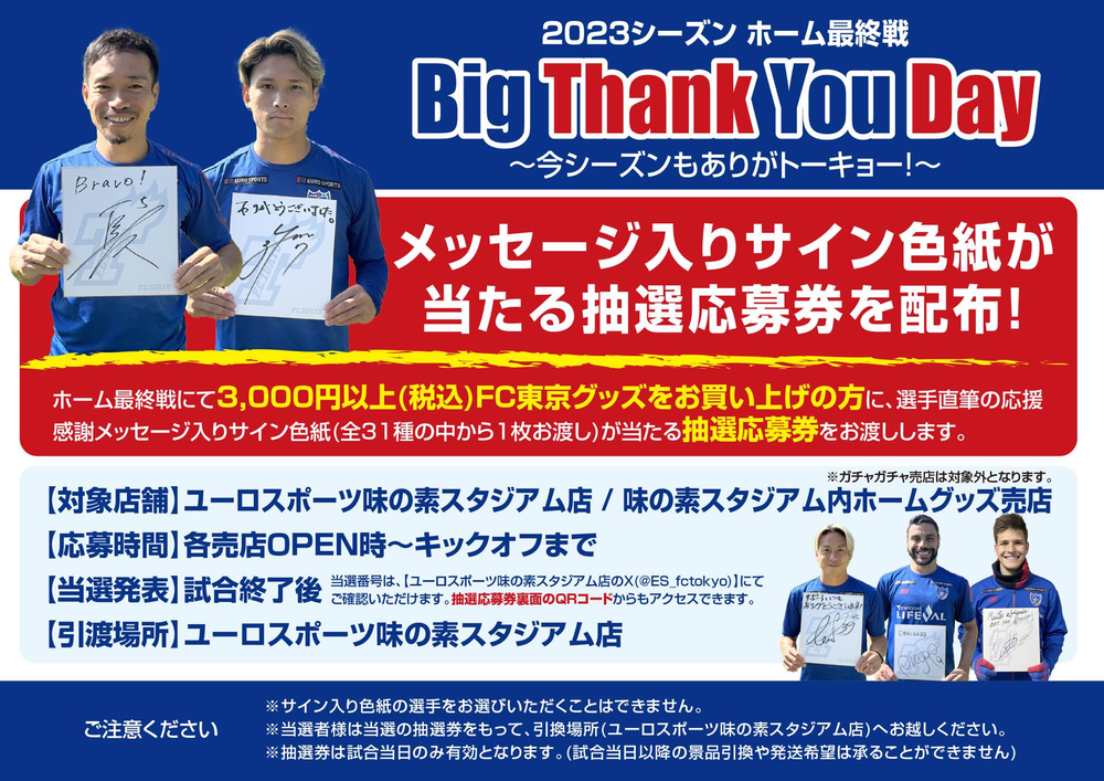 当日3,000円以上(税込)FC東京グッズをお買い上げの方に、選手直筆の応援感謝メッセージ入りサイン色紙が当たる抽選会を実施いたします。