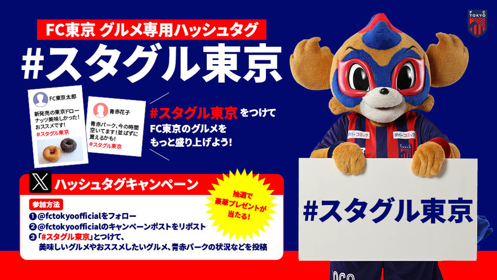 青赤パークや場内売店、オリジナルグルメ、選手コラボグルメなど、美味しいと思ったグルメの投稿に「#スタグル東京」をつけてFC東京のグルメを盛り上げましょう!