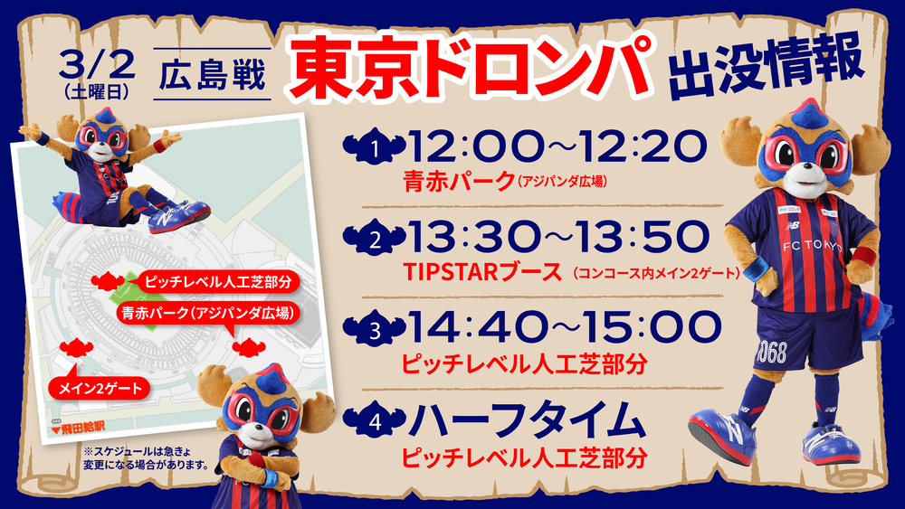 3月2日(土) 2024明治安田J1リーグ 第2節 vs サンフレッチェ広島 (15:00キックオフ/味の素スタジアム)に東京ドロンパが下記の通りあらわれます。ぜひお楽しみに!