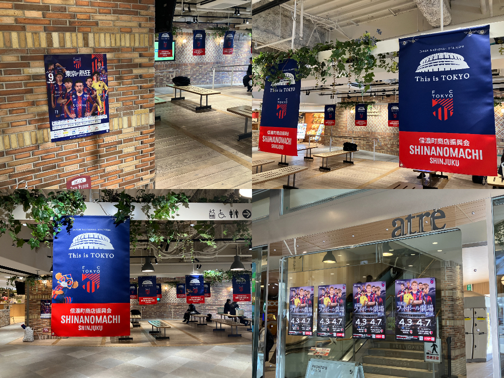 国立競技場でのホームゲームに向けて、信濃町商店振興会のアトレ信濃町でも店内を青赤に装飾してもらいました。