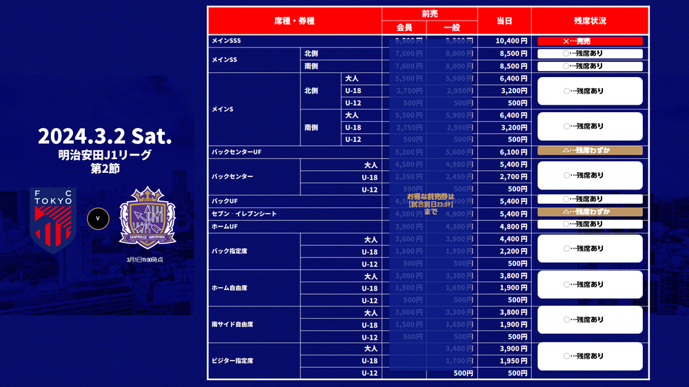 2024明治安田 J1リーグ 第2節 FC東京 vs サンフレッチェ広島(15:00キックオフ/味の素スタジアム)の当日券販売につきまして、下記のとおりお知らせいたします。