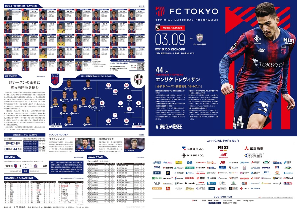 3月9日(土) 2024明治安田J1リーグ 第3節 vsヴィッセル神戸(16:00キックオフ/味の素スタジアム)のオフィシャルマッチデープログラムについて、下記のとおりご案内いたします。