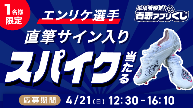 エンリケ 選手直筆サイン入りスパイクが当たる来場者限定「青赤アプリくじ」開催のお知らせ