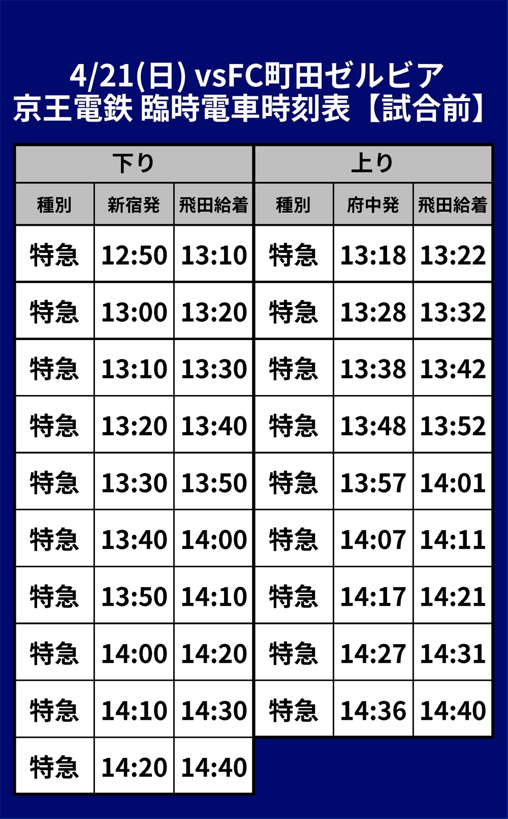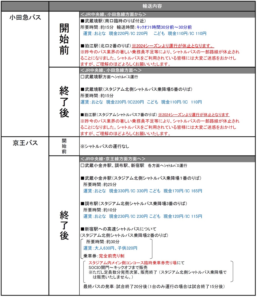 4月21日(日) 2024明治安田J1リーグ 第9節 vsFC町田ゼルビア(15:00キックオフ/味の素スタジアム)にて運行される臨時交通アクセス(鉄道)、シャトルバス・路線バスについてご案内いたします。