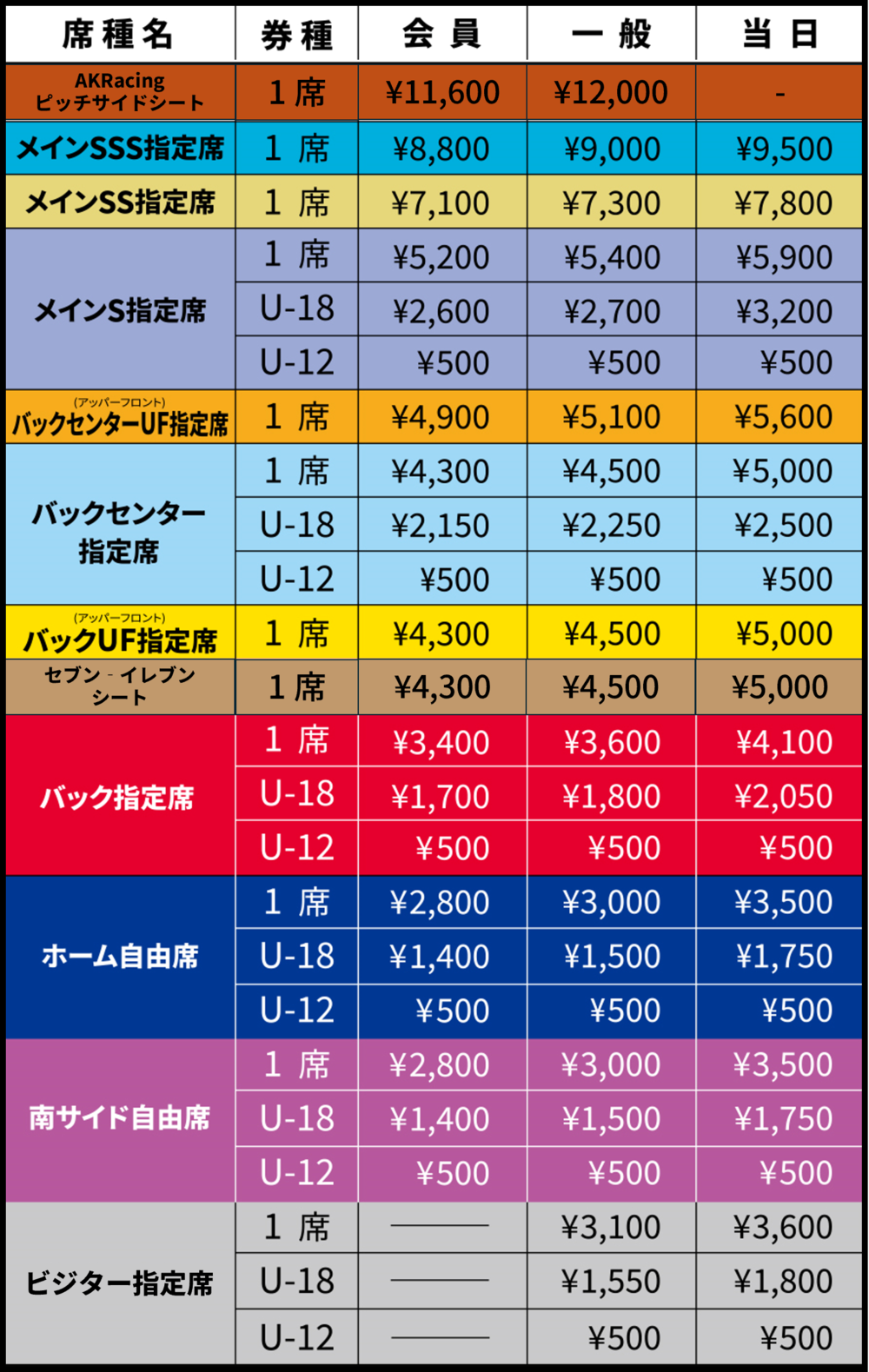 ※U-18料金は2006年4月2日生まれ以降の方、U-12料金は2012年4月2日生まれ以降の方が対象となります。未就学のお子様は保護者のお膝の上での観戦に限りチケットは必要ありません