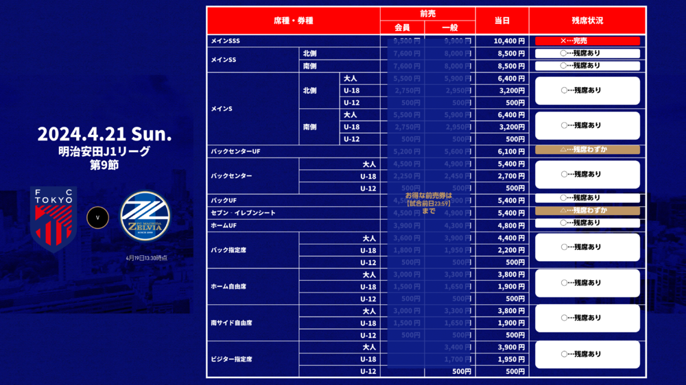 2024明治安田 J1リーグ 第9節 FC東京 vs FC町田ゼルビア(15:00キックオフ/味の素スタジアム)の当日券販売につきまして、下記のとおりお知らせいたします。