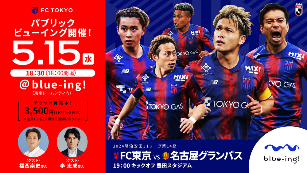 FC東京では、JFAサッカー文化創造拠点blue-ing!にて、5月15日(水)明治安田J1リーグ第14節の名古屋グランパス戦のパブリックビューイングを開催します。
