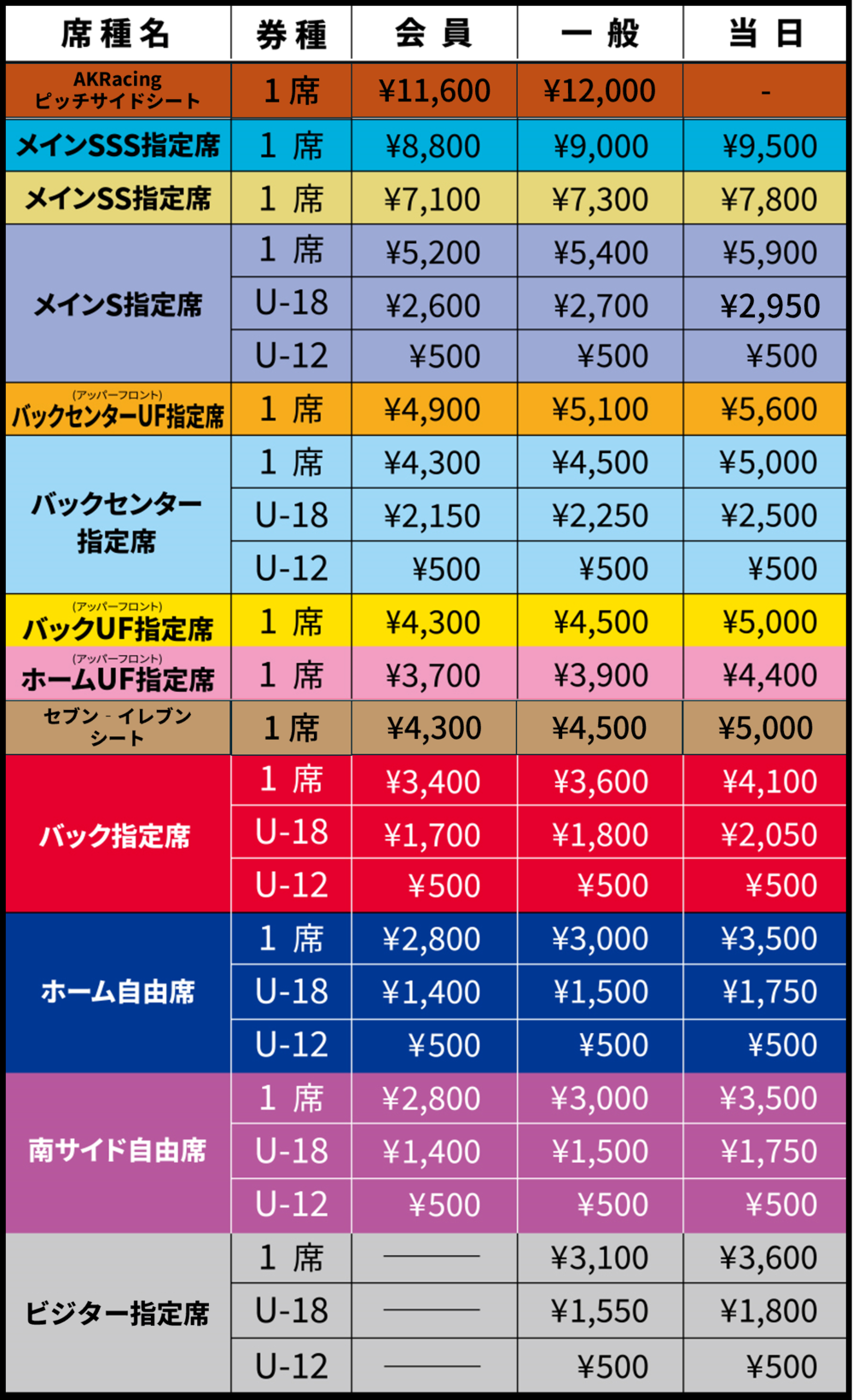 ※U-18料金は2006年4月2日生まれ以降の方、U-12料金は2012年4月2日生まれ以降の方が対象となります。未就学のお子様は保護者のお膝の上での観戦に限りチケットは必要ありません