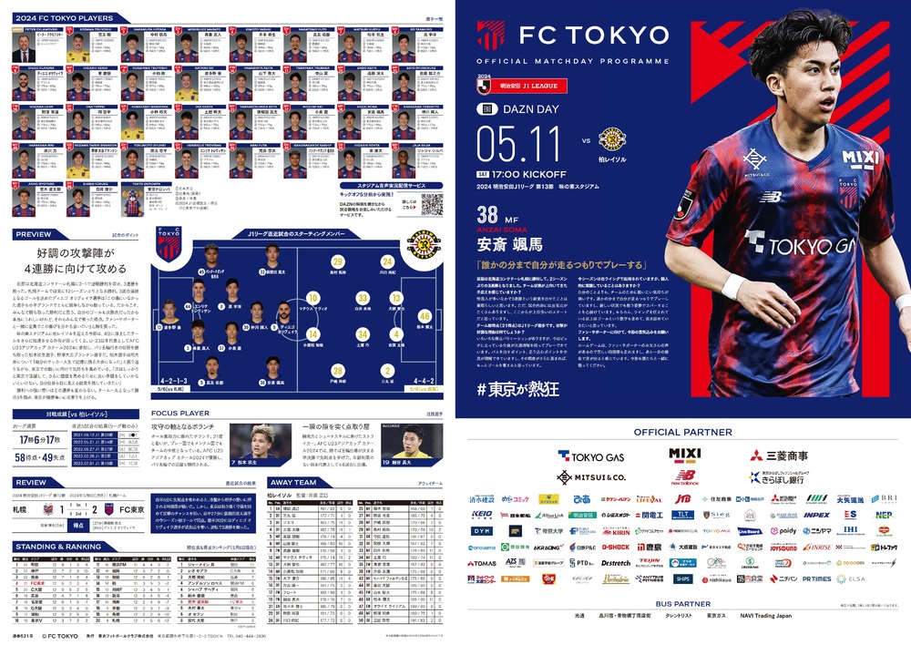 5月11日(土) 2024明治安田J1リーグ 第13節 vs柏レイソル(17:00キックオフ/味の素スタジアム)のオフィシャルマッチデープログラムについて、下記のとおりご案内いたします。