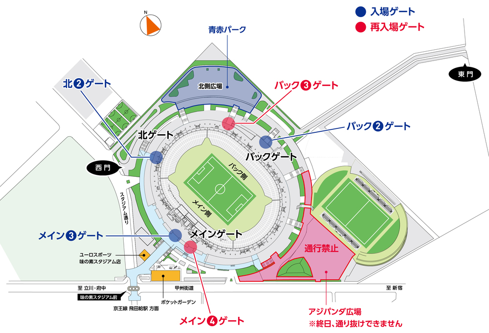 ※整理券をお持ちではない方は、キックオフ5時間前より最後尾にお並びいただけます。一度お並びいただいた後は列を離れることが可能です。対象となる開門時間の25分前に待機列エリアにお戻りください。なお、本試合ではアジパンダ広場の通り抜けおよび入場は不可となっております。