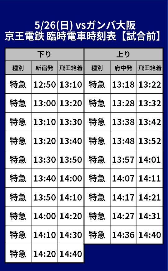 5月26日(日) 2024明治安田J1リーグ 第16節 vsガンバ大阪(15:00キックオフ/味の素スタジアム)にて運行される臨時交通アクセス(鉄道)、シャトルバス・路線バスについてご案内いたします。