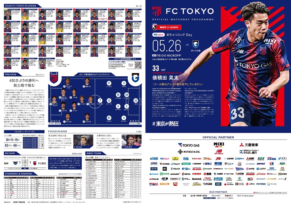 5月26日(日) 2024明治安田J1リーグ 第16節 vsガンバ大阪(15:00キックオフ/味の素スタジアム)のオフィシャルマッチデープログラムについて、下記のとおりご案内いたします。
